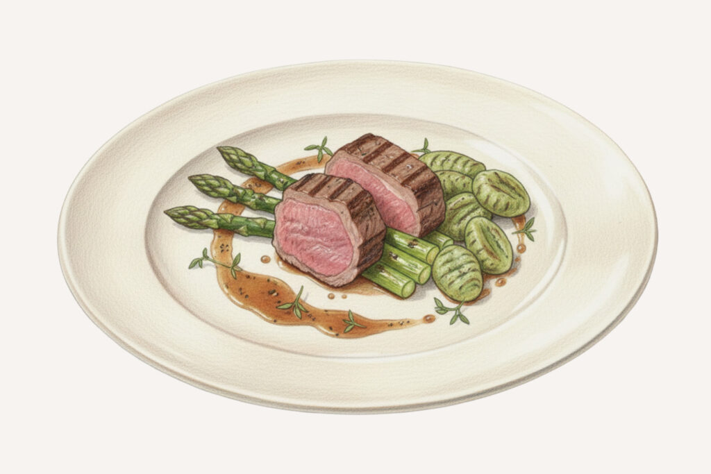 Rosa gegarter Lammrücken mit gegrilltem Spargel dazu Bärlauch-Gnocchis & Thymian-Jus