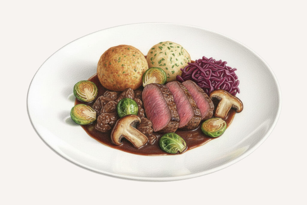 Filet & Ragout vom Rind, dazu zweierlei Knödel & Rotkraut